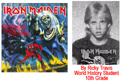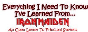 I suspect that perhaps Mr. Bradley just feels threatened that I know more about the subject he teaches than he does. It’s not exactly a secret that I’ve seen the band Iron Maiden in concert 57 times, and that I own every album they’ve ever released. This background has provided me with valuable insight well worth the costs of chronic hearing loss and bouts of epilepsy from prolonged exposure to stage pyrotechnics that have come with it. You see, listening to Iron Maiden is like riding in a turbo-charged time machine with a kick-ass stereo system.